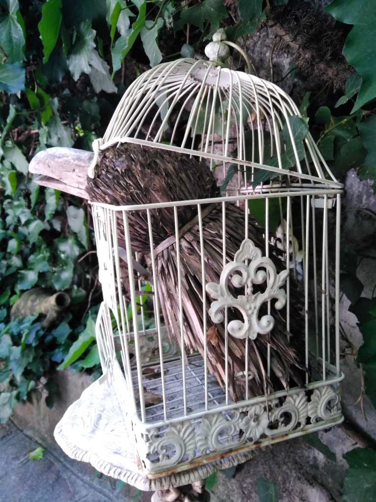 Una gabbia cosiddetta “decorativa” recuperata in un mercatino e un tucano (o uccello similare) di paglia. Ogni uccello va liberato dalla sua gabbia. Ogni uomo è “umanimale”. La metafora va da sé.