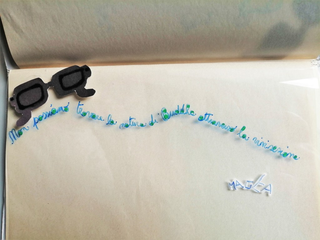 - “NON POSSIAMO TROVARE LA NATURA DI BUDDHA ATTRAVERSO LA VIVISEZIONE” massima filosofica Zen 150×20 tecnica mista: vetro sintetico liscio-trasparente, tempera acrilica a base d’acqua, occhiale rotto;