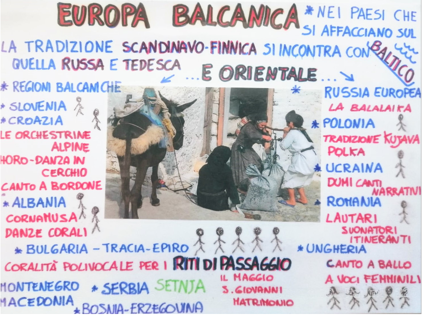 Attraverso i miei contatti con l’istituzione scolastica nasce una collaborazione ad un progetto nell a.s. 2014/2015 alla scuola media di Gravellona Toce, che ho intitolato: “Versatil…mente: suonando, danzando, cantando in Europa” ideato sia per studenti di scuola primaria che secondaria, avente come finalità la conoscenza e la salvaguardia della musica popolare. Vede coinvolti gli insegnanti di lettere, l’amica Maria Vittoria Rosa, e il professore di educazione musicale Domenico Botta, i quali dal secondo trimestre dell’anno scolastico iniziano un percorso di sensibilizzazione ad hoc, con la proposta nelle classi di testi e sussidi diversificati da me forniti. Nel mese di maggio gli alunni e le alunne coinvolti nel progetto si riuniscono nell’aula magna della scuola, per partecipare all’evento finale, condotto da me coadiuvata da I Lavertis e con il coinvolgimento di Eros e Daniela, come esperti in danze popolari. Una full immersion nella musica popolare piemontese, franco-occitana, fino a quella celtica, con escursione nel nord Europa, nei Balcani e nelle sonorità mediorientali e del Mediterraneo. Parto da lontano attirando l’attenzione e favorendo la partecipazione attiva dei ragazzi con slide, cartelloni, oggettistica varia e naturalmente canzoni e infine balli comunitari.