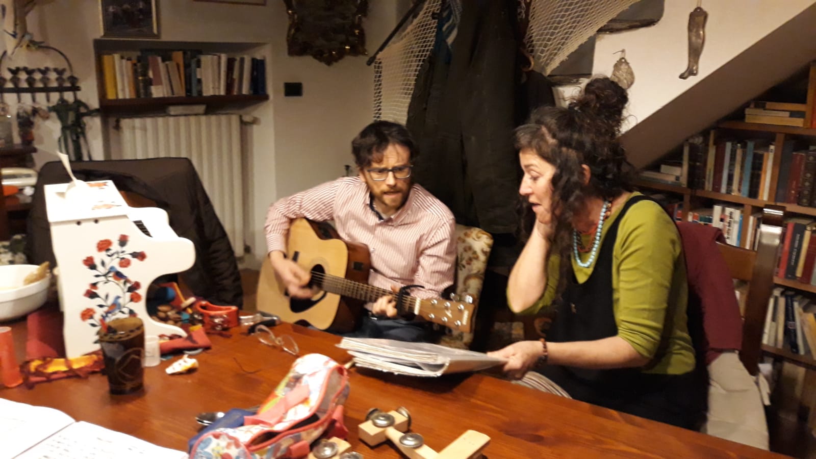 Il tentativo è quello di portare il pubblico in un viaggio metaforico nella musica popolare italiana ed europea. Un’importante finalità era quella di far conoscere alcune minoranze etniche: il popolo Rom e l’Occitania. Grazie all’ospitalità degli amici Erika e Thomas della casa Rosa di Agrano il 26 novembre 2017 Stato selvatico si esibisce per la prima volta. Lo spettacolo è intercalato da letture e da poesie. Compagna di viaggio e cantante dotatissima e abile sia nell’armonizzare in modo naturale, sia nella sua fisicità policroma tutta teatrale c’è Federica alias Pigi. Non posso non citare un episodio occorsoci ad una settimana dall’esibizione. In breve il nostro chitarrista ha un impegno inderogabile per il giorno del concerto e con rammarico ce lo comunica. Lui è Massimiliano con il quale ho condiviso un fecondo periodo di apprendimento dello strumento chitarra; un bagno nel rock e nel cantautorato. Oggi è un autore dotato e di talento. Pigi estrae il coniglio dal suo magico cappello: l’amico Giovanni, aspirante liutaio poco più che ventenne; lui può imparare in pochi giorni i brani, gli accordi, i tappeti musicali. Ci precipitiamo a casa sua: ed è così e anche di più! Giovanni con la sua maestria e il suo talento ci ha accompagnate con discrezione, grazia e…pazienza nei concerti a venire!