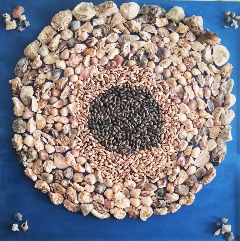 Mia madre è una vera “raccoglitrice” degna di questo nome. Durante il suo lungo soggiorno marino porta a casa alcune specie di conchiglie. In autunno raccoglie funghi, mele selvatiche e castagne; in inverno infiorescenze secche di varia natura; in primavera, terra, ramoscelli fioriti e talee di piante che rinvasa e fa crescere rigogliosamente. Leggo su “Middlesex” (pag.545, 2002 Oscar Mondadori) che l’autore J.Eugenides rifacendosi alla biologia evolutiva, descrive gli uomini come cacciatori atavici e le donne come raccoglitrici e da qui tutti i problemi riguardanti la percezione della realtà da parte degli uni e delle altre… Sta di fatto che nell’estate 2019 mi ritrovo con un centinaio di questi meravigliosi gusci, doni del mare e ne realizzo un “mandala da tavolo”, sul retro dell’abitazione. Redarguisco amorevolmente mia madre per questa sua mania un po’ ossessiva di raccolta che la impegna con la schiena curva mattina e parte del pomeriggio, spiegandole che le conchiglie fanno parte del mare e là dovrebbero rimanere…tant’è…dopo la sua partenza realizzo “Mother’s Mandala”.