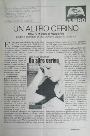 “Un altro cerino” è la mia seconda pubblicazione cartacea del 2007. Un vero percorso a ritroso dentro la linea matriarcale della mia famiglia. Sono legata moltissimo alla figura di zia Maria, sorella di mia nonna di parte materna (già “Frammenti Cantabili” lo dedicai in primis a lei). Oggi parlerei di psico-genealogia e di costellazioni familiari, nel senso che ho saputo riconoscere e nobilitare le emozioni e i sentimenti intimi che questa prozia mi ha lasciato, sia nei ricordi indelebili dell’infanzia, sia in un suo diario che ho trascritto integralmente, fonte concreta del testo editato; andavo via via a scoprire, come in un viaggio eroico, i suoi sogni, le aspettative, i travagli, la forza d’animo che ella visse in quel periodo storico. Nata nel 1920 a Villadossola da una famiglia già numerosa e povera, seppe prendere in mano la propria vita, grazie alla sua tenacia e alla sua caparbietà, superando ostacoli di ogni genere. Dalle pagine del diario di Maria diciassettenne, racchiuse in un periodo che va dal 1937 al 1941, si evince in particolare la passione per la vita, per lo studio, per la professione di ostetrica che svolgerà dal 1942 al 1959. Il suo italiano da quinta elementare è “datato ma assolutamente corretto, espressivo e deciso” (“Un altro cerino” a cura di Danila Tassinari, Alternativa A, il Libro pag.17); pagine struggenti sulla figura della propria madre persa all’età di sei anni a causa di un aborto procurato da una mammana di paese. Tutto partì probabilmente da questo terribile fatto…capire, lavorare, studiare riscattarsi. Il libro è poi corredato da numerose foto di “cerini”; un cerino è infatti un nuovo bambino che viene alla luce! In aggiunta una ricerca sul tipo di nascite avvenute a Villadossola dal 1942 al 1975 e numerose foto d’epoca. Il volume è depositato presso l’Archivio dei diari di Pieve Santo Stefano e nella Biblioteca comunale dello stesso paese sede appunto dell’Archivio Diaristico Nazionale dal 1984.