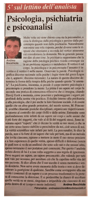 Una delle prime questioni che mi è capitato sovente di dovere dibattere e spiegare anche in ambienti informali, è quella relativa alle differenze esistenti tra psicologia psichiatria e psicoanalisi. Tema che il prof. Bocchiola ha affrontato nella sua interessante rubrica su Eco Risveglio dal titolo “5 minuti sul lettino dell’analista” e che riporto per intero.